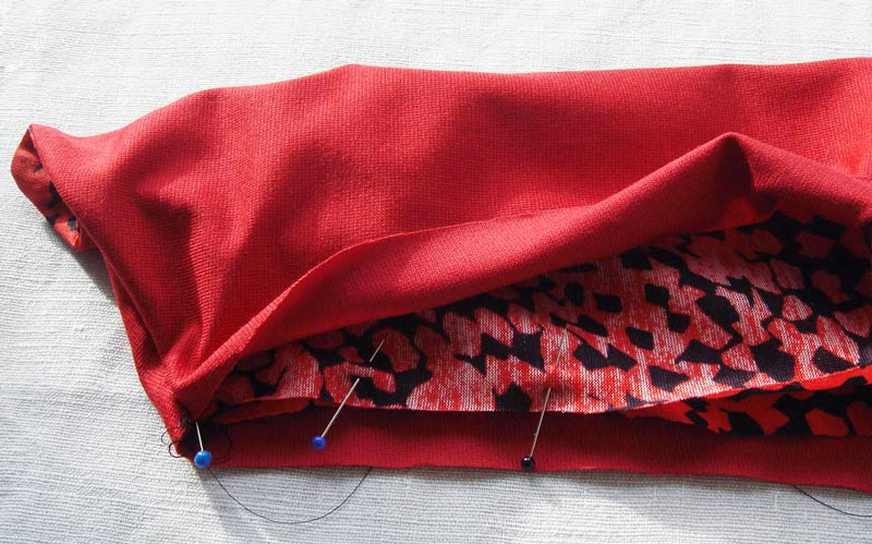 Verstürzen Sie die obere und untere Kante rechts gegen rechts mit der Overlock oder mit einem dehnbaren Zickzackstich der Nähmaschine.