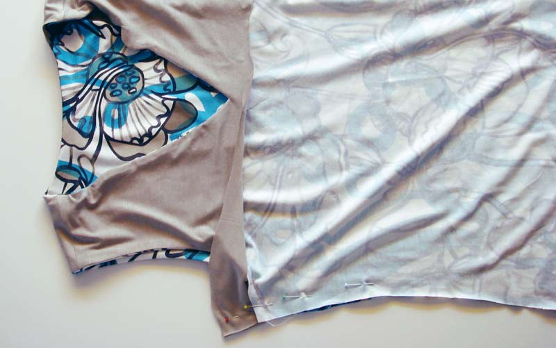 Stecken Sie den Besatz rechts gegen rechts auf Ihr Shirt. Die Armlochausschnitte und der Ausschnitt von Vorder- und Rückenteil passen aufeinander.